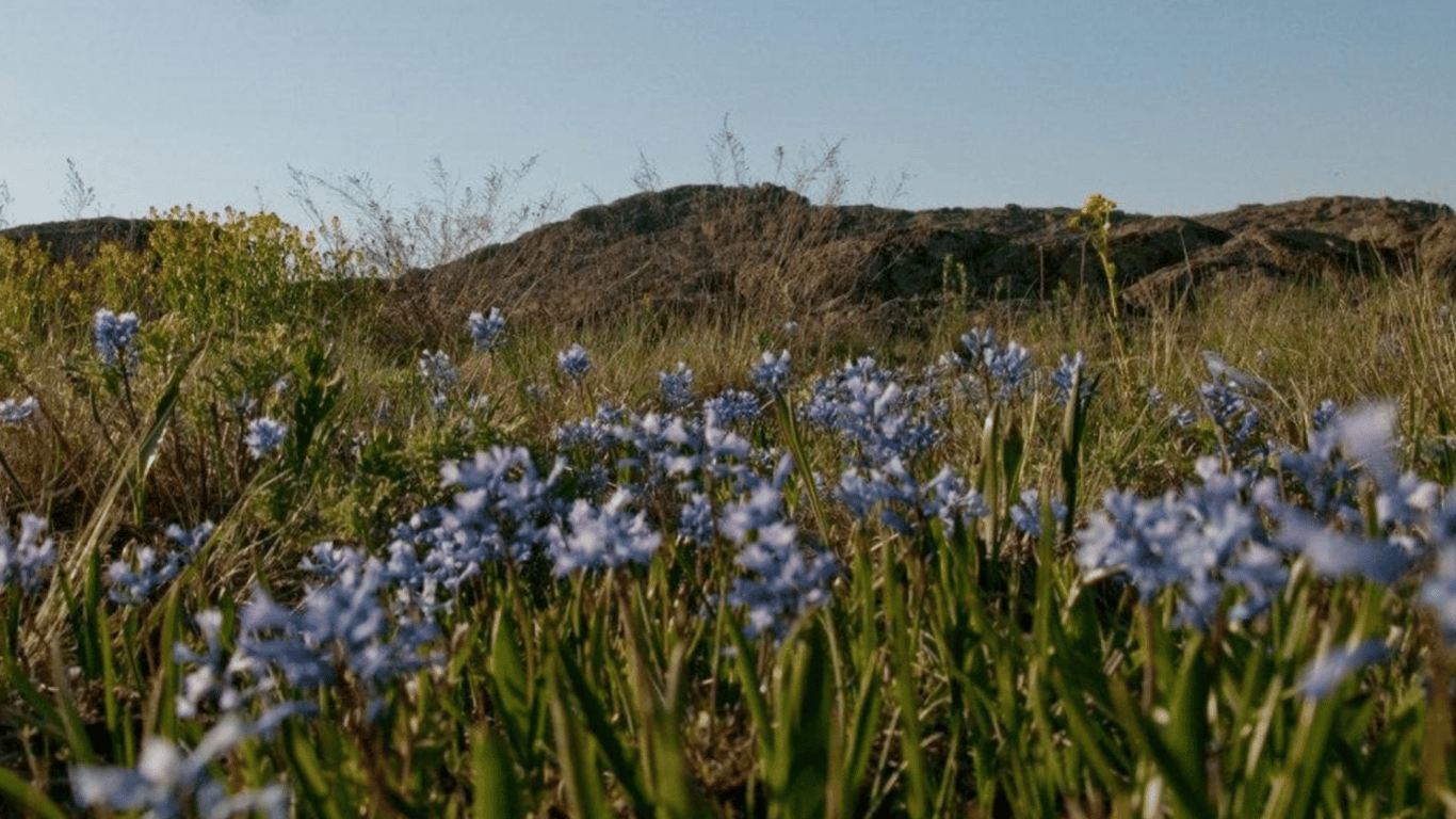 Якщо ви уважно подивитеся на фотографію, то побачите, що на ній є галявина із заповідника "Кам’яні могили". На знімку можна помітити звичайну красиву галявину, вкриту неймовірними квітами синього кольору, і гори на задньому фоні.