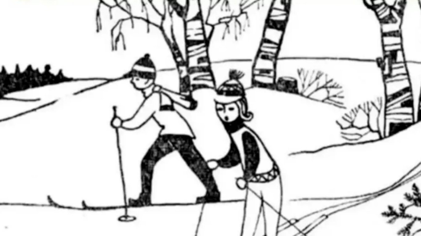 На чорно-білому малюнку двоє людей катаються на лижах. Чоловік і жінка у вовняних шапках, рукавичках, з лижним спорядженням. Навколо них — дерева та пагорби. Але десь там є й кролик, який ховається у всіх на виду.