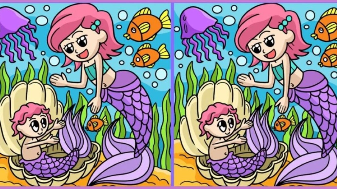 Русалка мама спілкується зі своїм малюком на морському дні. Чи зможете ви знайти різницю між двома зображеннями за 10 секунд?