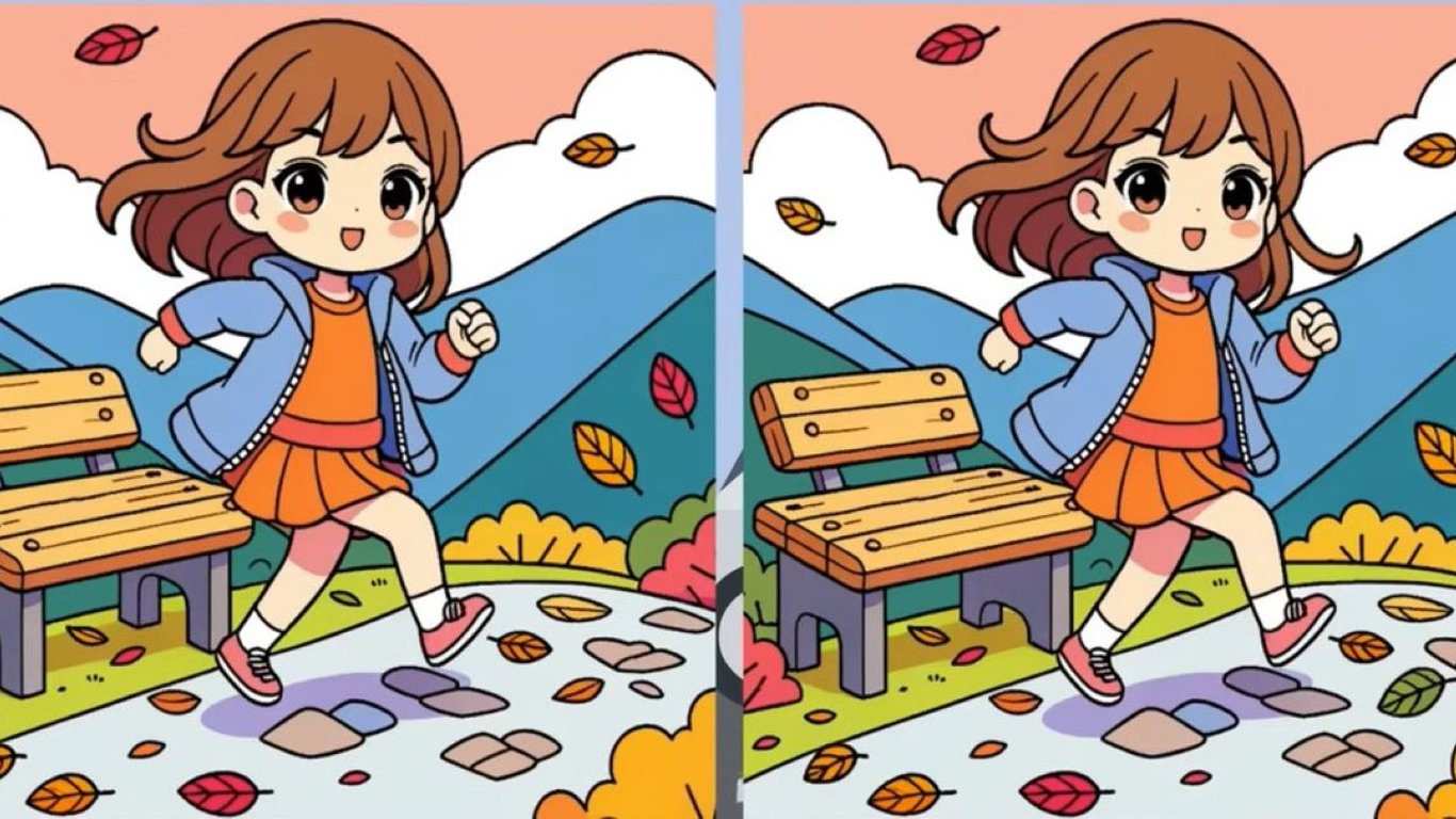 На майже однакових картинках весела дівчинка встала з лавочки та рішуче почимчикувала кудись. Поки вона не пішла, знайдіть три істотні відмінності між малюнками.