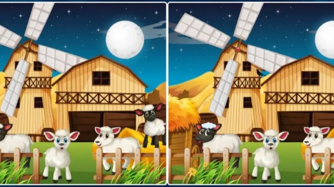Ферма з млином, вівцями та іншим господарством. Серед розмаїття дрібних деталей потрібно знайти п'ять відмінностей між двома малюнками за 12 секунд.