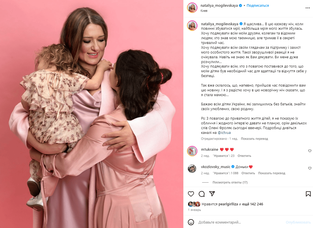 "Так вже склалось, що, напевно, прийшов час повідомити вам цю новину. І я з радістю хочу в цю новорічну ніч сказати, що я стала мамою… Бажаю всім дітям України, які залишились без батьків, знайти своїх коханих, свою родину", — стверджує Наталія Могилевська.