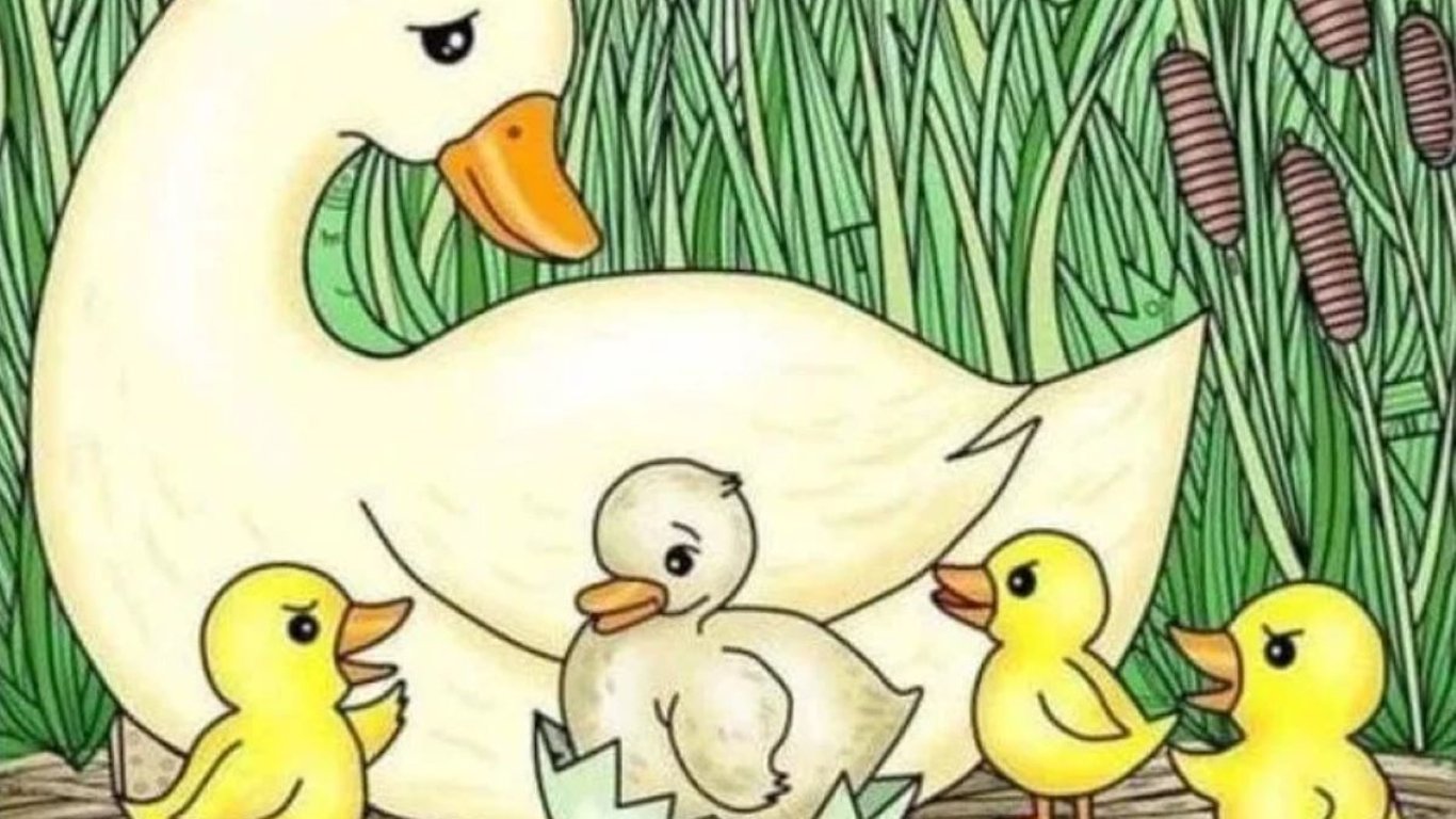 На малюнку зображена мама-качка з чарівними каченятами. Одне з них щойно вилупилося зі шкаралупи. Але чи бачите ви голку, що ховається в очереті?