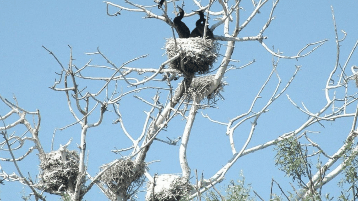Перед собой вы можете увидеть обычную фотографию, на которой есть необычное дерево. На этом дереве сидит несколько бакланов — один расположился на ветке, еще несколько сидят в гнезде, а вот одна птица решила улететь куда-то.