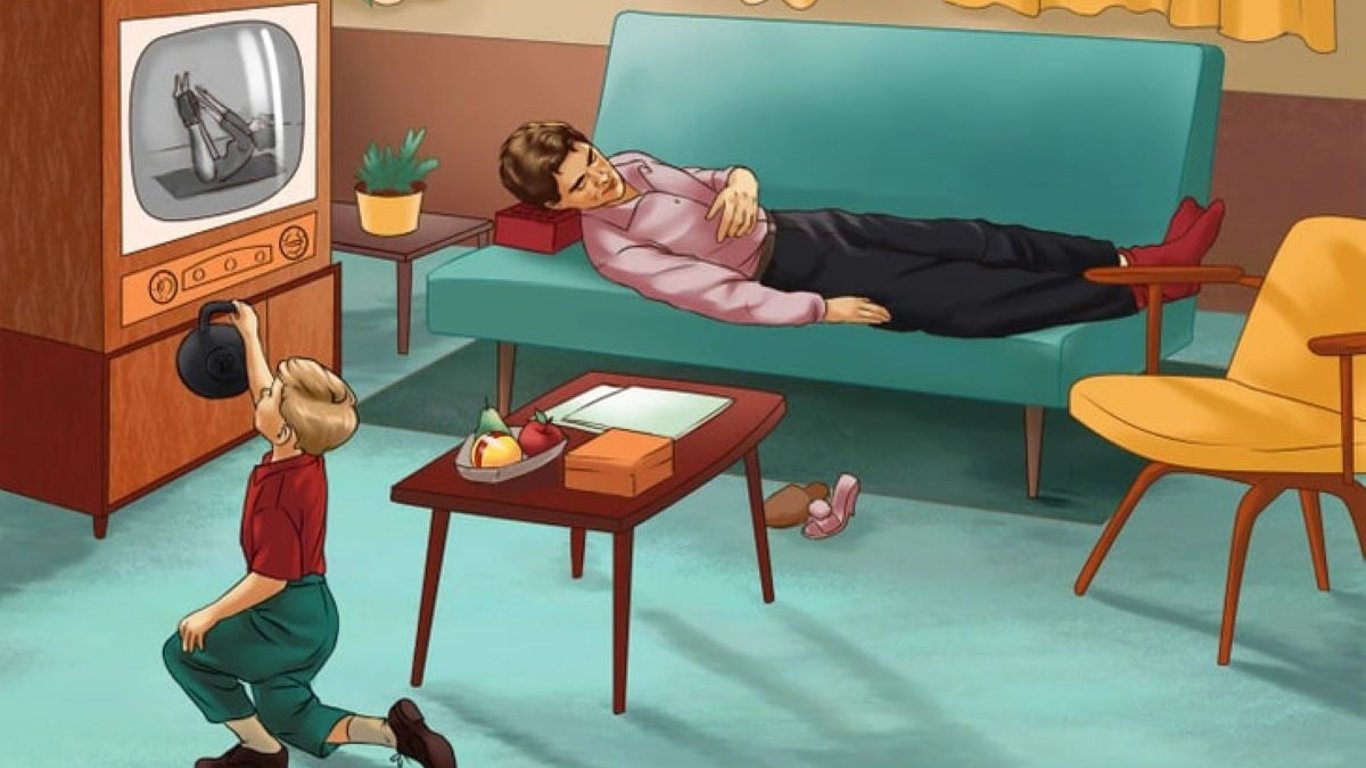 Полуденный отдых в комнате с телевизором. Необходимо найти семь ошибок на изображении в течение 20 секунд.