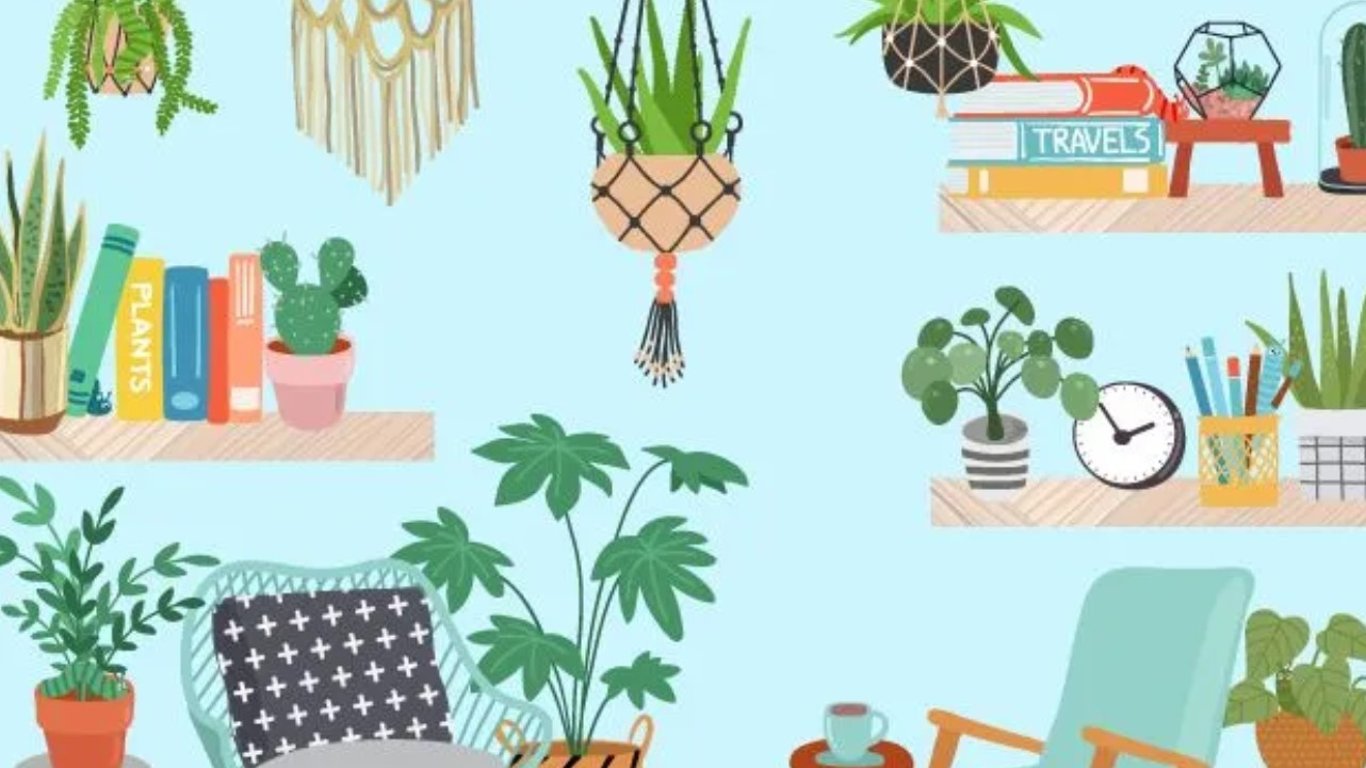 Ботанический пейзаж комнаты с горшечными растениями, суккулентами и изящной лейкой — мечта дизайнера интерьера. Кроме растений, здесь есть два плюшевых кресла, три полки, книги, ручки и часы.