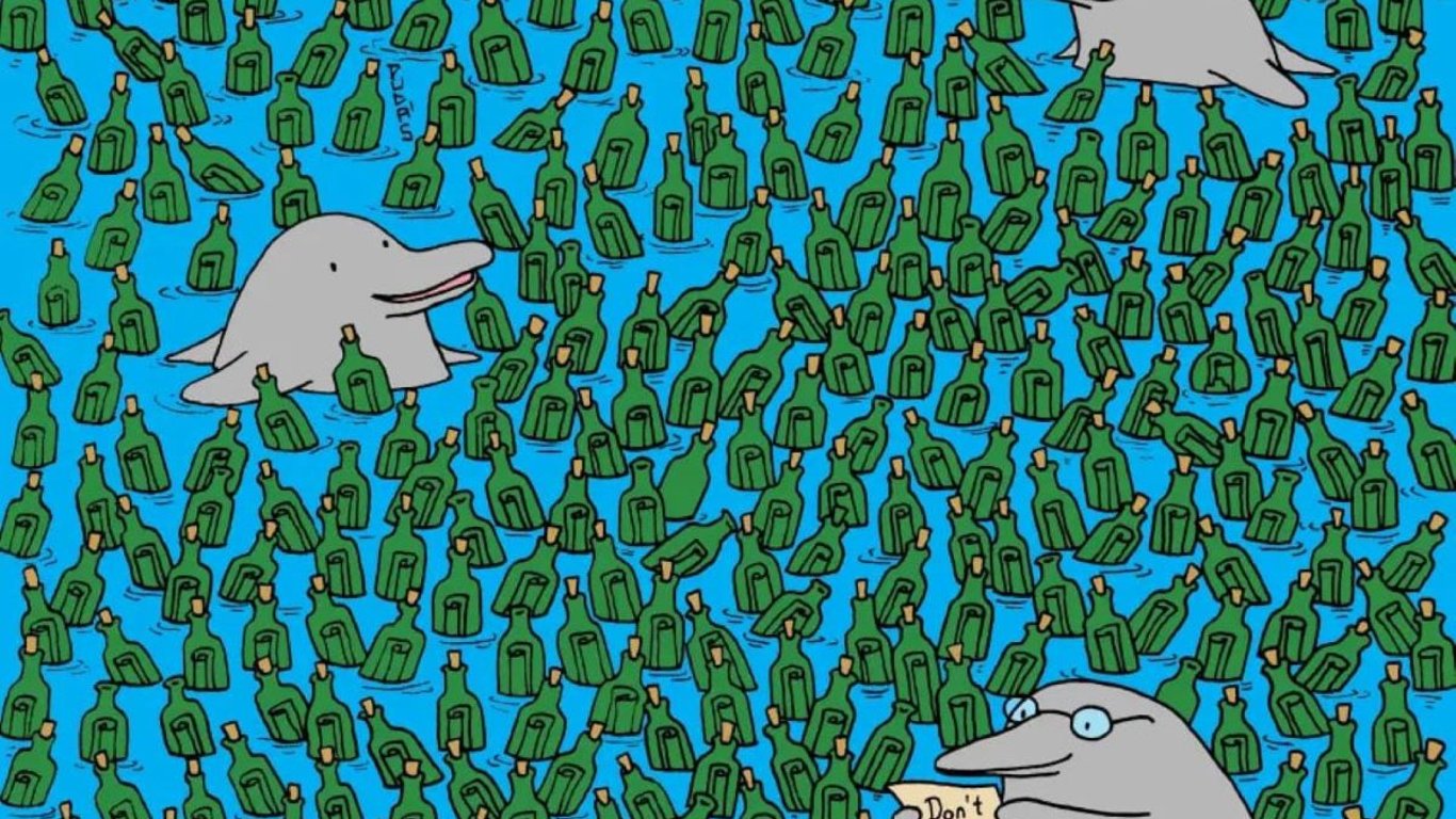 Три дельфина разбирают морскую корреспонденцию — письма в бутылках. Работа кропотливая, но в пяти бутылках сообщений нет — найдите их за 15 секунд.