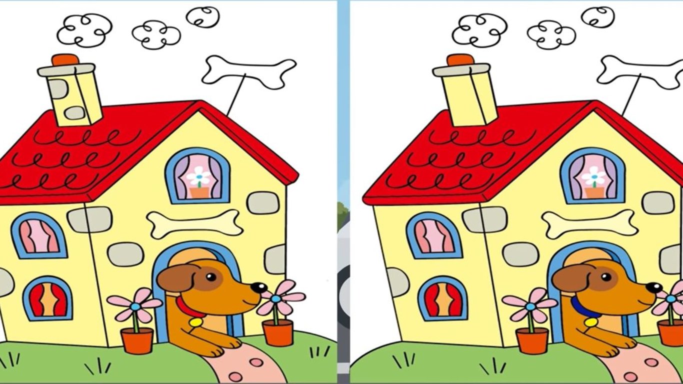 Две одинаковые картинки с веселой собачкой, которая живет в красивой будке, больше похожей на домик. Но между ними есть три отличия — найдите их.