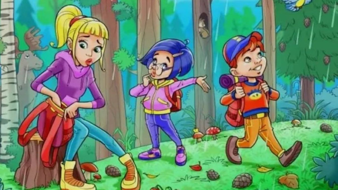 Яркая лесная сцена с туристами. Все персонажи имеют рюкзаки. Видно лося, енота, белку и птицу. Растут большие елки, везде разбросанные шишки. Но где-то на рисунке изображен зонтик, который нужно найти за 20 секунд.