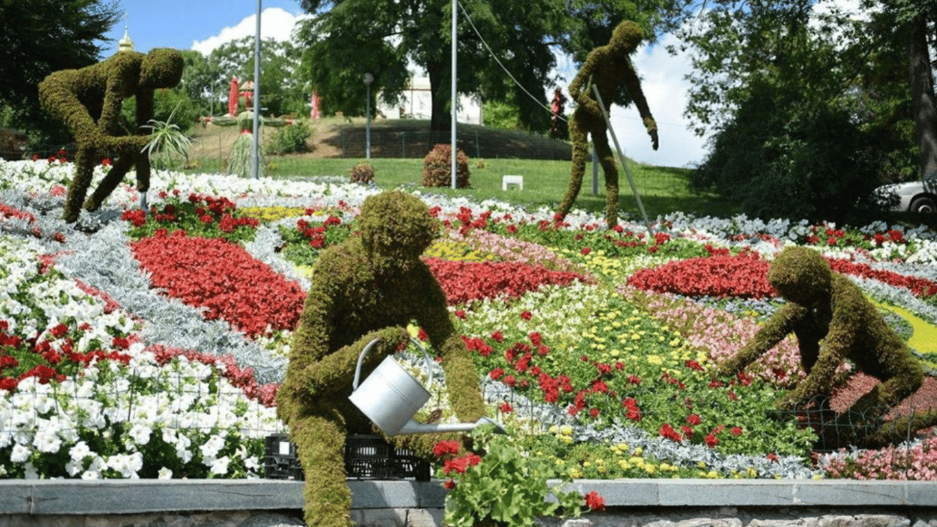 Зверніть увагу на зелену скульптуру "садівника", який ніби поливає квіти на першому плані на фото. Саме на садовій лійці ви і побачите маленьку пташку, яка теж, здається, вирішила допомогти доглядати за рослинами.
