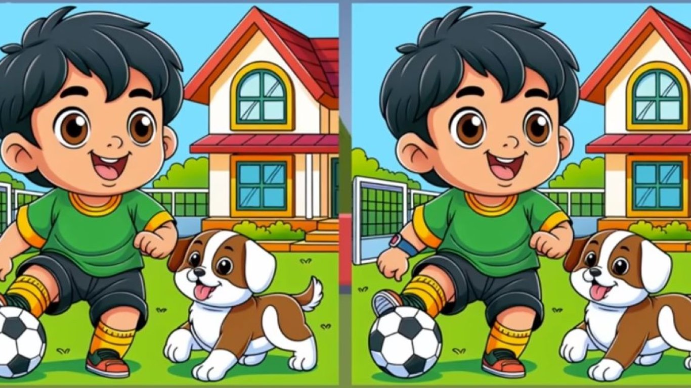 Спробуйте знайти три відмінності, хоча це складно, з огляду на величезну кількість дрібних деталей на малюнках. Двоповерховий будинок, гарний паркан, галявинка, хлопчик з м'ячем та маленький собака. Але на кожному елементі зображення вистачає нюансів.