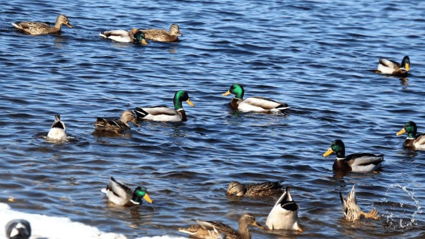Подивіться уважно на фотографію, на якій можна помітити багато різних качок. Всі вони плавають у водоймі та насолоджуються теплом, а біля них на суші можна побачити у голубів. Мабуть, дивлячись на цей знімок у вас виникне відчуття, що ви також хочете поплавати просто зараз.