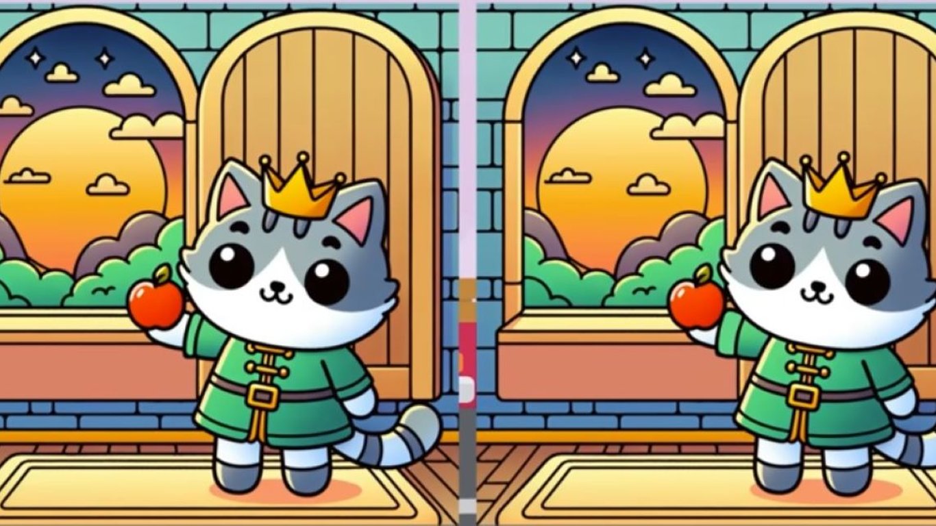 Кумедний котячий король з яблуком у лапах на тлі відкритого вікна замку, за яким сідає Сонце. Порівняйте дві картинки та знайдіть три відмінності.